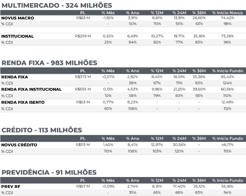 - A rentabilidade de 12M é calculada utilizando a cota atual contra a última cota disponível no mesmo dia, N meses atrás. 2. O patrimônio líquido utilizado corresponde ao patrimônio do Master do respectivo fundo. 3. Em 07/12/2018 os fundos Modal Tactical e Modal Institucional mudaram de nome respectivamente para Novus Macro e Novus Institucional e foram para gestão da Novus Capital; em 26/11/2018 o fundo Modal Prev mudou de nome para Novus Prev e foi para gestão da Novus Capital. 4. A rentabilidade Início Novus é calculada utilizando a cota atual contra a cota disponível em 31/08/2018. 5. A rentabilidade Início Fundo, para o fundo Novus Renda Fixa, é calculada utilizando a cota atual contra a cota disponível em sua data de início – 30/04/2019, enquanto para o fundo Novus Renda Fixa Institucional, é calculada utilizando a cota atual contra a cota disponível em sua data de início – 17/09/2021, e para o Novus Renda Fixa Isento, é calculada utilizando a cota atual contra a cota disponível em sua data de início – 13/09/2024. 6. A rentabilidade Início Fundo, para o fundo Novus Prev Renda Fixa, é calculada utilizando a cota atual contra a cota disponível em sua data de início – 30/11/2020. 7. A rentabilidade Início Fundo, para o fundo Novus Crédito, é calculada utilizando a cota atual contra a cota disponível em sua data de início – 15/09/2022. “A Novus Capital Gestora de Recursos Ltda. (“NOVUS”) não comercializa nem distribui quotas de fundos de investimento ou qualquer outro ativo financeiro. Este documento não constitui uma oferta de serviço pela NOVUS, tem caráter meramente informativo e é para uso exclusivo de seu destinatário, não devendo ser utilizado para quaisquer outros fins. As informações contidas neste documento são confidenciais e não devem ser divulgadas a terceiros sem o prévio e expresso consentimento da NOVUS. A NOVUS utiliza informações de fontes que acredita serem confiáveis, mas não se responsabiliza pela exatidão de quaisquer das informações assim obtidas e utilizadas neste documento, as quais não foram independentemente verificadas. Estas informações podem estar desatualizadas ou sujeitas a opiniões divergentes. Para avaliação da performance de quaisquer fundos de investimentos, é recomendável uma análise de período de, no mínimo, 12 (doze) meses. Determinados fundos referidos podem utilizar estratégias com derivativos como parte integrante de sua política de investimento. Tais estratégias, da forma como são adotadas, podem resultar em significativas perdas patrimoniais para seus cotistas, podendo inclusive acarretar perdas superiores ao capital aplicado e a consequente obrigação do cotista de aportar recursos adicionais para cobrir o prejuízo do fundo. Os resultados obtidos no passado não representam garantia de resultados futuros e não contam com garantia da NOVUS, de qualquer de suas afiliadas, de qualquer mecanismo de seguro ou, ainda, do Fundo Garantidor de Créditos – FGC. Este documento não constitui uma opinião ou recomendação, legal ou de qualquer outra natureza, por parte da NOVUS, e não leva em consideração a situação particular de qualquer pessoa. A utilização das informações aqui contidas se dará exclusivamente por conta e risco de seu usuário. Antes de tomar qualquer decisão acerca de seus investimentos, a NOVUS recomenda ao interessado que consulte seu próprio consultor legal. Ao investidor é recomendada a leitura cuidadosa do regulamento do fundo e do prospecto, se houver, ao aplicar seus recursos. Investimentos implicam na exposição a riscos, inclusive na possibilidade de perda total do investimento.”