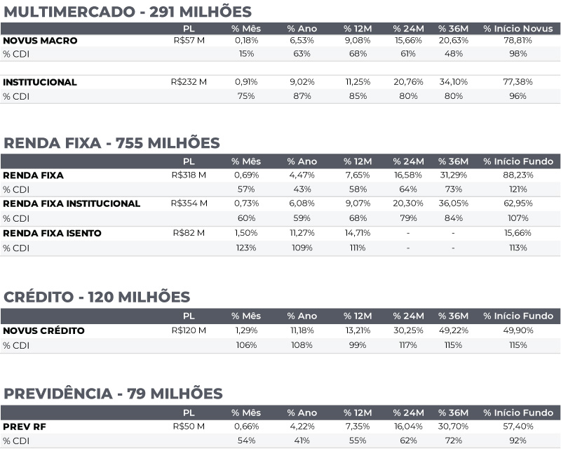 - A rentabilidade de 12M é calculada utilizando a cota atual contra a última cota disponível no mesmo dia, N meses atrás. 2. O patrimônio líquido utilizado corresponde ao patrimônio do Master do respectivo fundo. 3. Em 07/12/2018 os fundos Modal Tactical e Modal Institucional mudaram de nome respectivamente para Novus Macro e Novus Institucional e foram para gestão da Novus Capital; em 26/11/2018 o fundo Modal Prev mudou de nome para Novus Prev e foi para gestão da Novus Capital. 4. A rentabilidade Início Novus é calculada utilizando a cota atual contra a cota disponível em 31/08/2018. 5. A rentabilidade Início Fundo, para o fundo Novus Renda Fixa, é calculada utilizando a cota atual contra a cota disponível em sua data de início – 30/04/2019, enquanto para o fundo Novus Renda Fixa Institucional, é calculada utilizando a cota atual contra a cota disponível em sua data de início – 17/09/2021, e para o Novus Renda Fixa Isento, é calculada utilizando a cota atual contra a cota disponível em sua data de início – 13/09/2024. 6. A rentabilidade Início Fundo, para o fundo Novus Prev Renda Fixa, é calculada utilizando a cota atual contra a cota disponível em sua data de início – 30/11/2020. 7. A rentabilidade Início Fundo, para o fundo Novus Crédito, é calculada utilizando a cota atual contra a cota disponível em sua data de início – 15/09/2022. “A Novus Capital Gestora de Recursos Ltda. (“NOVUS”) não comercializa nem distribui quotas de fundos de investimento ou qualquer outro ativo financeiro. Este documento não constitui uma oferta de serviço pela NOVUS, tem caráter meramente informativo e é para uso exclusivo de seu destinatário, não devendo ser utilizado para quaisquer outros fins. As informações contidas neste documento são confidenciais e não devem ser divulgadas a terceiros sem o prévio e expresso consentimento da NOVUS. A NOVUS utiliza informações de fontes que acredita serem confiáveis, mas não se responsabiliza pela exatidão de quaisquer das informações assim obtidas e utilizadas neste documento, as quais não foram independentemente verificadas. Estas informações podem estar desatualizadas ou sujeitas a opiniões divergentes. Para avaliação da performance de quaisquer fundos de investimentos, é recomendável uma análise de período de, no mínimo, 12 (doze) meses. Determinados fundos referidos podem utilizar estratégias com derivativos como parte integrante de sua política de investimento. Tais estratégias, da forma como são adotadas, podem resultar em significativas perdas patrimoniais para seus cotistas, podendo inclusive acarretar perdas superiores ao capital aplicado e a consequente obrigação do cotista de aportar recursos adicionais para cobrir o prejuízo do fundo. Os resultados obtidos no passado não representam garantia de resultados futuros e não contam com garantia da NOVUS, de qualquer de suas afiliadas, de qualquer mecanismo de seguro ou, ainda, do Fundo Garantidor de Créditos – FGC. Este documento não constitui uma opinião ou recomendação, legal ou de qualquer outra natureza, por parte da NOVUS, e não leva em consideração a situação particular de qualquer pessoa. A utilização das informações aqui contidas se dará exclusivamente por conta e risco de seu usuário. Antes de tomar qualquer decisão acerca de seus investimentos, a NOVUS recomenda ao interessado que consulte seu próprio consultor legal. Ao investidor é recomendada a leitura cuidadosa do regulamento do fundo e do prospecto, se houver, ao aplicar seus recursos. Investimentos implicam na exposição a riscos, inclusive na possibilidade de perda total do investimento.”