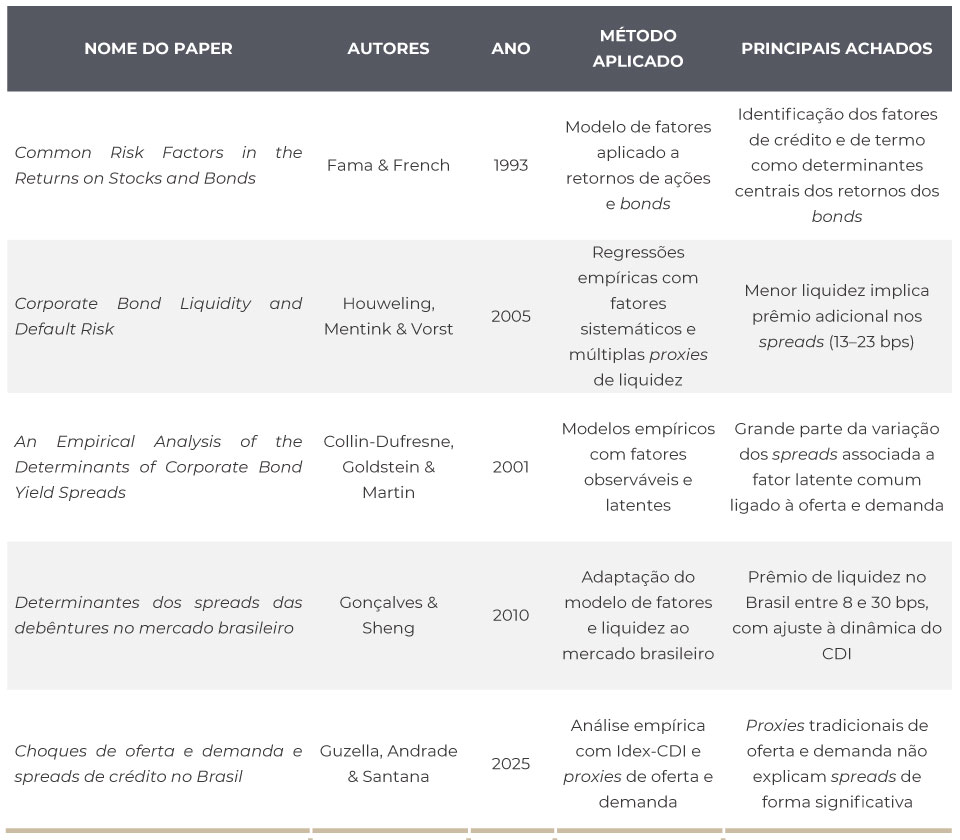 Mais recentemente, a discussão passou a incorporar de forma mais explícita o papel de choques de oferta e demanda. Guzella, Andrade e Santana (2025) investigaram essa dinâmica utilizando o spread médio ponderado do índice JGP Idex-CDI como variável dependente. Os autores testaram proxies tradicionais de oferta, associadas ao volume de emissões primárias, e de demanda, relacionadas ao volume negociado no mercado secundário, além de variáveis de controle como juros de longo prazo, inclinação da curva, VIX e desempenho do mercado acionário. Os resultados, no entanto, não indicaram evidência estatisticamente significativa de que essas proxies explicassem de forma consistente o comportamento dos spreads no mercado brasileiro.