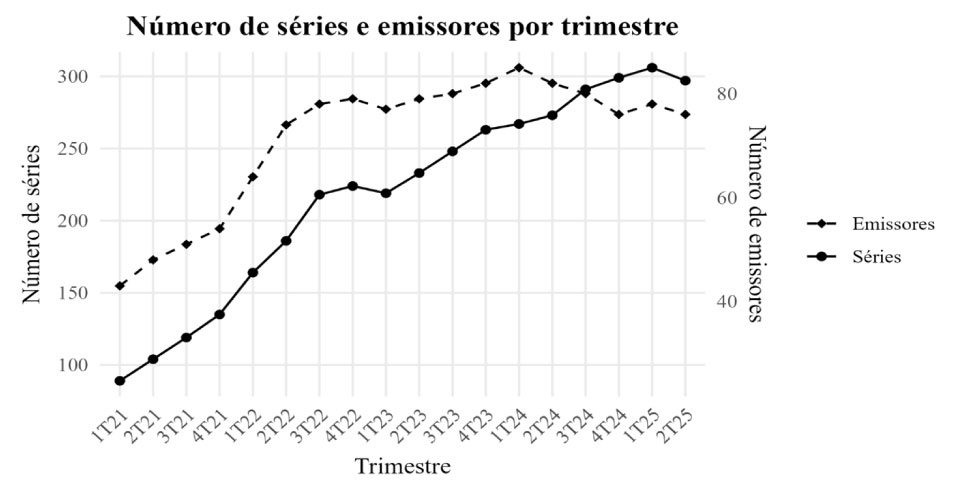 A figura apresentada ilustra essa dinâmica ao mostrar a expansão gradual do número de séries e emissores ao longo do período analisado, refletindo o crescimento e a maior representatividade do mercado de debêntures nos últimos anos.
