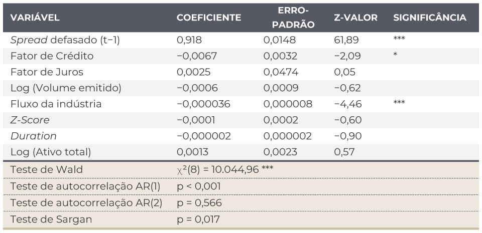 Para a análise empírica, estimamos a equação apresentada utilizando a metodologia de System GMM, o que permite trabalhar com um painel desbalanceado de debêntures e emissores. Essa abordagem é especialmente adequada ao contexto do mercado brasileiro, no qual novas séries entram ao longo do tempo, emissores deixam de negociar no mercado secundário e algumas emissões perdem liquidez em determinados períodos. Ao permitir a inclusão de observações com diferentes horizontes temporais, o modelo endereça de forma mais apropriada potenciais vieses de sobrevivência e de existência, comuns em bases de crédito que evoluem rapidamente.