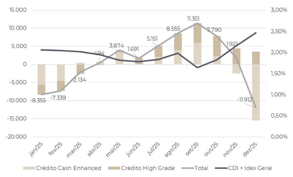 Entre maio e setembro, as entradas se aceleram de forma expressiva, atingindo seu ponto máximo em setembro. Esse movimento foi liderado pelo segmento de crédito High Grade, mas contou também com contribuição relevante do Cash Enhanced, indicando uma recomposição mais ampla de posições em crédito ao longo desse intervalo.