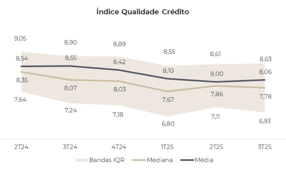 O IQC foi construído a partir do 2T24 e vem sendo alimentado trimestralmente com todos os ratings da amostra desde então. Como mostra o gráfico acima, observa-se uma deterioração gradual da qualidade de crédito ao longo dos últimos trimestres. O rating mediano recuou de 8,35 no 2T24 para 7,78 no 3T25, enquanto o rating médio caiu de 8,54 para 8,06 no mesmo período. A queda conjunta da média e da mediana indica que o movimento não está concentrado apenas em casos pontuais, mas reflete uma piora mais disseminada na qualidade de crédito do universo analisado.